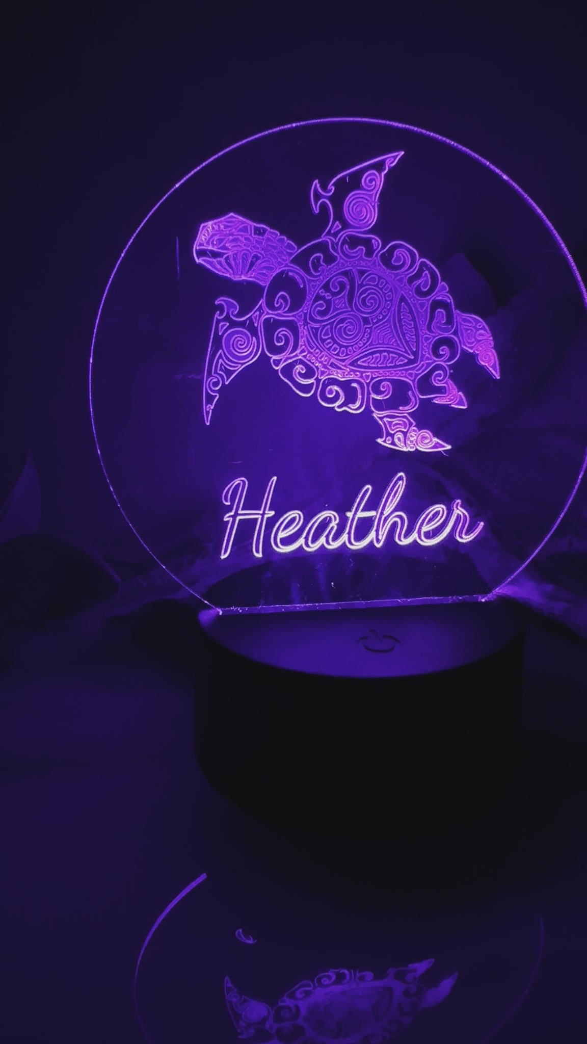Illuminate your space with a touch of personalized charm! This Mandala Turtle acrylic night light features a custom design of your choice, beautifully etched into durable acrylic for a soft, glowing effect. It comes with a sleek black base, and can be powered either with a wall plug or by batteries for ultimate flexibility. Perfect for bedrooms, nurseries, or any space that needs a bit of warmth and personalization.